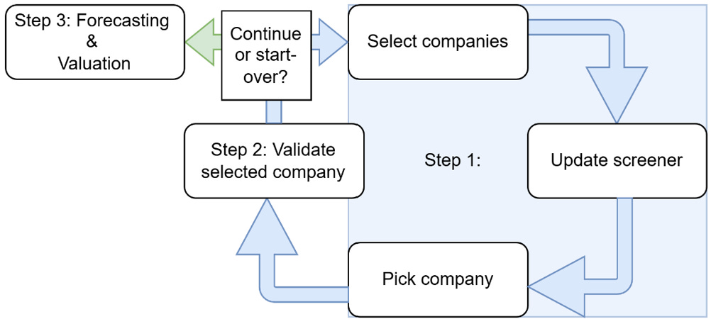 Remember, the screener is meant to be a tool that we keep using time and again as we look for new opportunities or assess old ones with new data. We will iterate through the first two steps, illustrated below, many times: