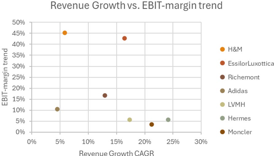 Let us now turn to a combination of EBIT-margin trend with revenue growth: