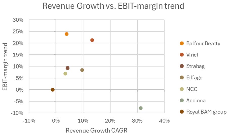 Standout performance clearly belongs to Vinci, which has delivered both double-digit revenue growth and significantly expanded their margins over time. Balfour Beatty, on the other hand, has clearly succeeded in increasing how much they get from every Euro earned; however, they have a razor thin EBIT margin at 1.7% in 2024, which doesn’t leave the company with much flexibility.