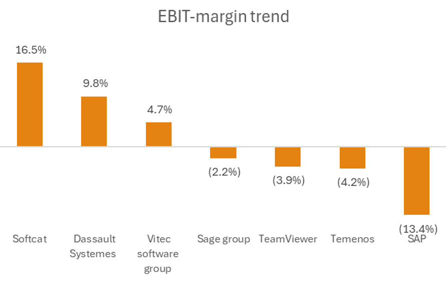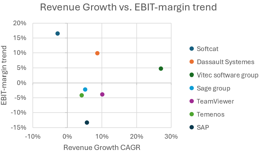 The four companies with decreasing margins (Sage Group, TeamViewer, Temenos, SAP) are most likely being challenged by new technology disrupting their offering. For instance, SAP is constantly challenged by new solutions, especially disruptors that develop solutions that challenge the idea of company-wide ERP.