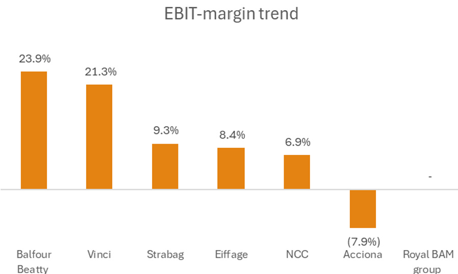 Note: Royal BAM group’s EBIT in 2020 was negative (-3.3%), and it is not possible to calculate a margin trend when the starting point is negative. In 2024, it was 0.9%.