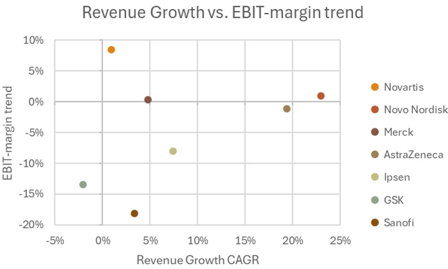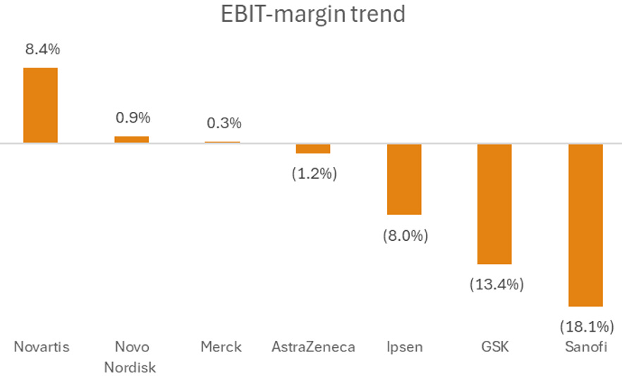 Pharma: Novartis leads EBIT-margin gains; Novo Nordisk excels overall, while Sanofi, GSK, and Ipsen lag.