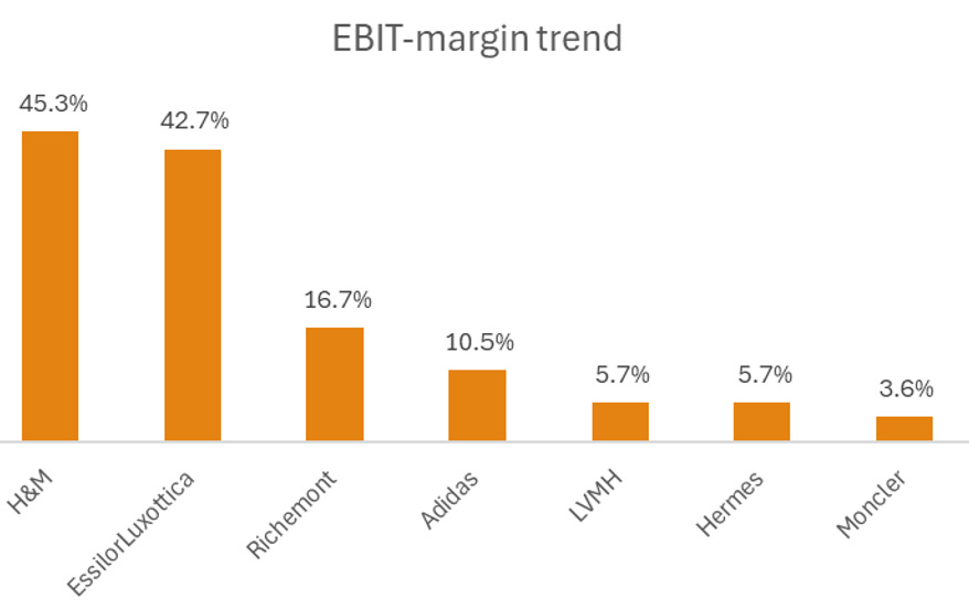 Next there’s Fashion, where we have an interesting mix of companies. The range from low-cost fast fashion to high-cost luxury products should be reflected in EBIT-margin trends and defensibility of margins. In the graph below, we can see that the top performers are not only luxury companies: